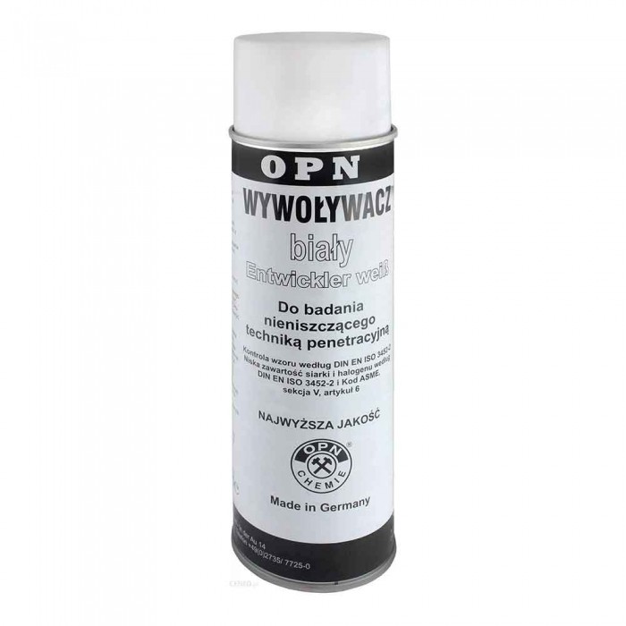OPN Wywoływacz (Biały) to profesjonalny środek w aerozolu, który umożliwia wizualizację wad powierzchniowych niewidocznych gołym okiem. Działa na zasadzie "bibuły" – po naniesieniu na badaną powierzchnię, wyciąga czerwony penetrant z najgłębszych mikropęknięć, barwiąc białą powłokę w miejscu wystąpienia usterki.